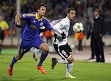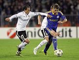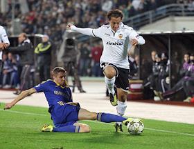 Лига чемпионов УЕФА 2012-2013. Матч между командами БАТЭ (Борисов, Беларусь) и "Валенсия" (Испания). Игрок ФК "Валенсия" Роберто Соладо (слева) во время матча.