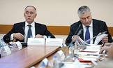 Директор Федеральной службы по наркоконтролю Виктор Иванов (слева) и министр внутренних дел России Владимир Колокольцев (справа) на совместном заседании коллегий ФСКН России и МВД России. Заседание прошло в здании ФСКН России.