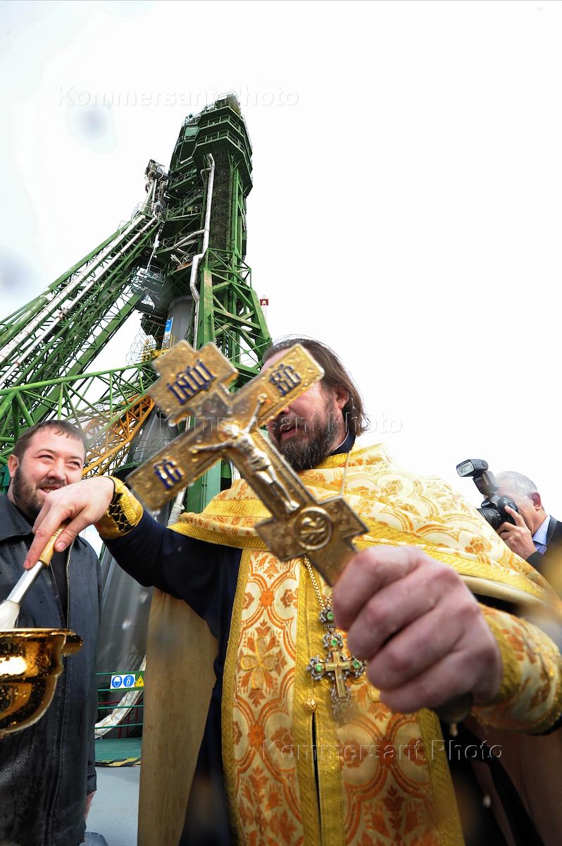 Виды космодрома "Байконур". Церемония освящения ракетоносителя "Союз-ФГ" с пилотируемым комплексом "Союз-ТМА" перед полетом.