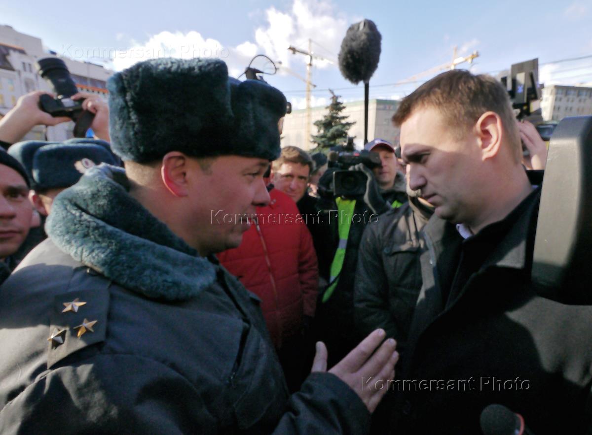 Цепь одиночных пикетов "От Лубянки до Лефортово. Мы против репрессий и пыток" прошла от здания ФСБ на Лубянской площади до Следственного Комитета в Техническом переулке. Блогер Алексей Навальный (справа) во время проведения пикетов.