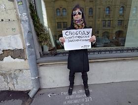 Цепь одиночных пикетов "От Лубянки до Лефортово. Мы против репрессий и пыток" прошла от здания ФСБ на Лубянской площади до Следственного Комитета в Техническом переулке. Архитектурный критик Елена Гонсалес с плакатом "Сегодня пытают и сажают их, а завтра вас!" во время проведения пикетов..