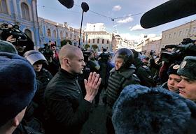 Цепь одиночных пикетов "От Лубянки до Лефортово. Мы против репрессий и пыток" прошла от здания ФСБ на Лубянской площади до Следственного Комитета в Техническом переулке. Лидер движения "Левый фронт" Сергей Удальцов (слева) во время проведения пикетов.