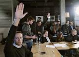 Писатель Дмитрий Быков (в центре) и председатель Координационного совета оппозиции (КСО) Алексей Навальный (второй справа) на первом заседании Координационного совета оппозиции в кафе DOME.