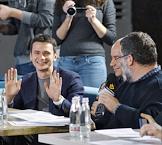 Писатель Дмитрий Быков (слева) и председатель Координационного совета оппозиции (КСО) Алексей Навальный (справа) на первом заседании Координационного совета оппозиции в кафе DOME.