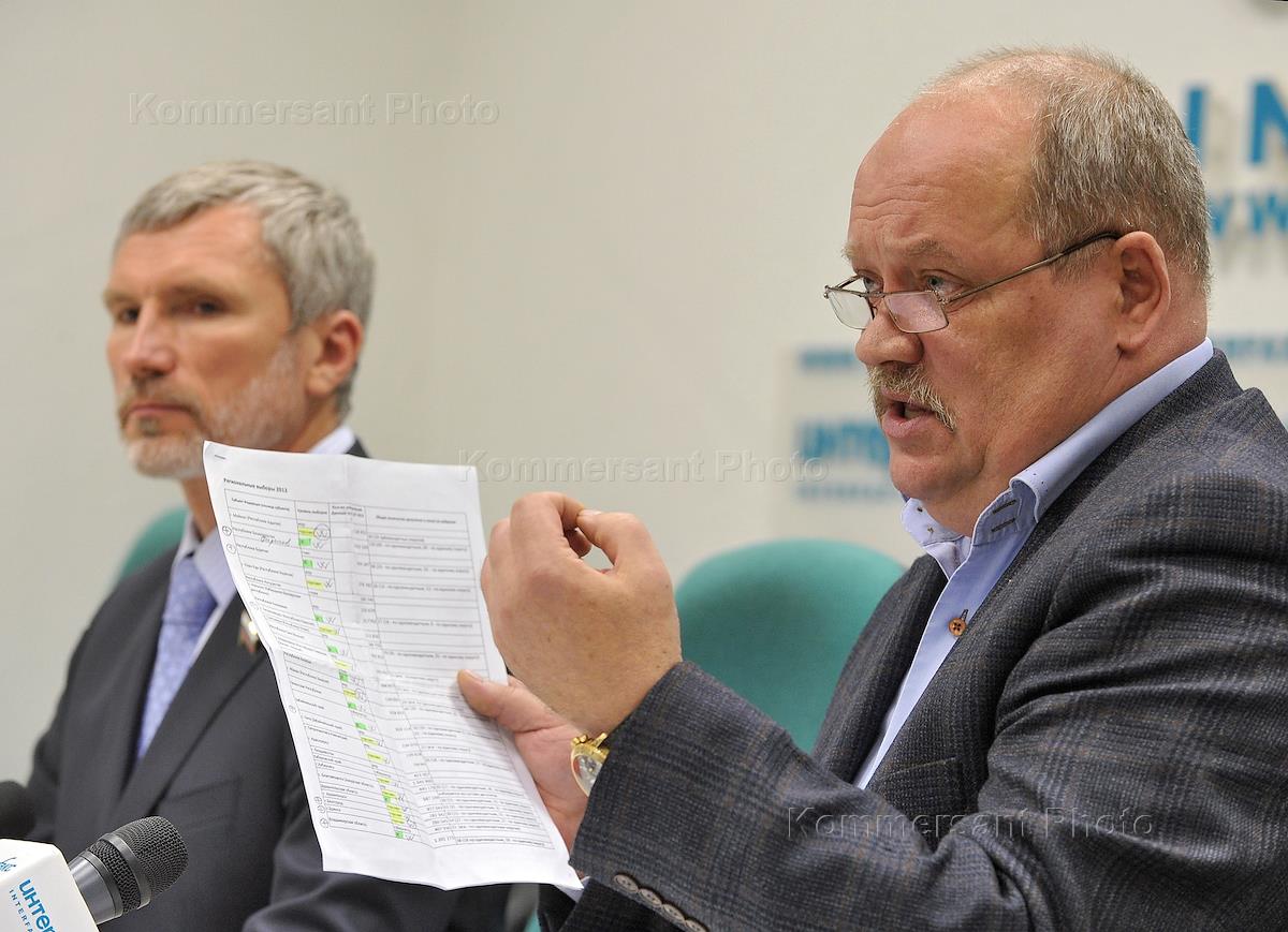 Chairman of the "Rodina", a member of the State Duma of Russia on Defense Alexey Zhuravlev (left) and Chairman of the Russian Party of Pensioners, a member of the State Duma Committee on Defense Igor Zotov (right) at the press conference, "Termination of "Rodina" GDP" and the Russian party retired political agreement in 2006 with the party "A Just Russia". Press conference was held at the agency "Interfax".