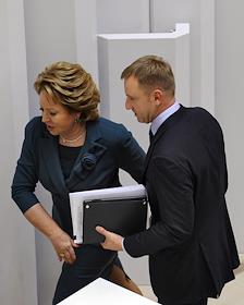Председатель Совета Федерации России Валетина Матвиенко (слева) и министр образования и науки России Дмитрий Ливанов (справа) во время пленарного заседания Совета Федерации России.