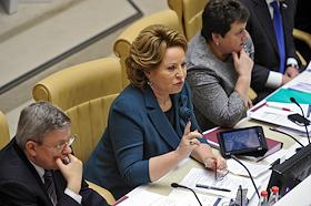 Председатель Совета Федерации России Валентина Матвиенко (вторая слева) и ее заместители Александр Торшин (слева) и Светлана Орлова (справа) во время пленарного заседания Совета Федерации России.
