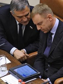 Представитель в Совете Федерации России от парламента Республики Северная Осетия-Алания Валерий Кадохов (слева внизу) и член Совета Федерации России от Самарской области Константин Титов (в центре) во время пленарного заседания Совета Федерации.