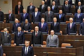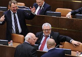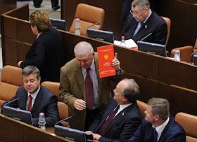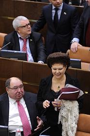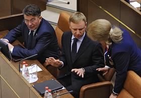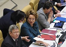 Пленарное заседание Совета Федерации. Представитель Пензенской области в Совете Федерации Борис Шпигель (слева), представитель от правительства Республики Хакасия Валентина Петренко (справа), член Совета Федерации России от Самарской области Константин Титов (слева вверху) во время заседания.