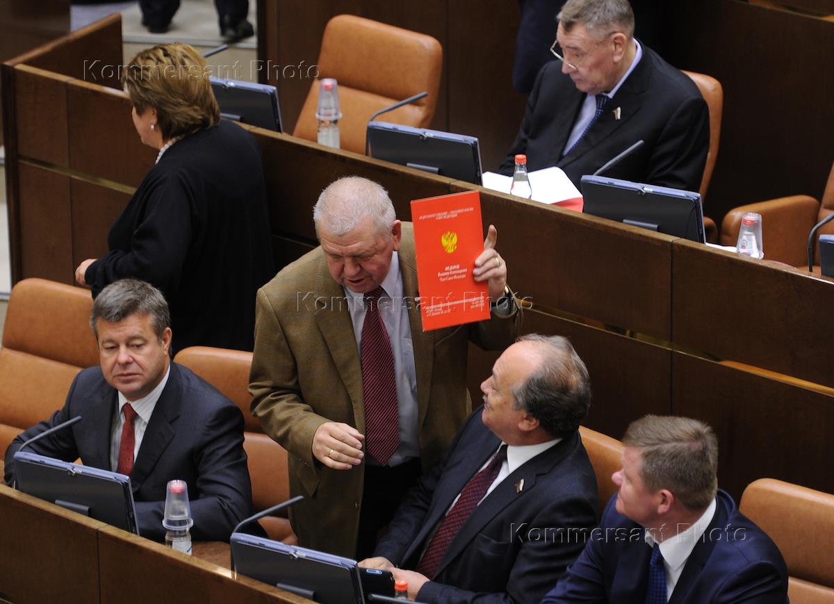 Пленарное заседание Совета Федерации. Слева направо: представитель в Совете Федерации (СФ) России от Саратовской областной думы, председатель комитета СФ России по промышленному комплексу Валентин Завадников, представитель в СФ России от законодательного (представительного) органа государственной власти Республика Карелия Владимир Федоров, представитель от исполнительного органа государственной власти города Москвы Юрий Росляк, представитель Саратовской бласти в СФ России Михаил Исаев во время заседания.
