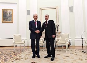 Президент Израиля Шимон Перес (слева) во время встречи с президентом России Владимиром Путиным (справа) во время официальной встречи в Кремле.