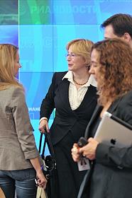Министр здравоохранения России Вероника Скворцова (в центре) на пресс-конференции, посвященной модернизации системы здравоохранения. Пресс-конференция прошла в РИА "Новости".