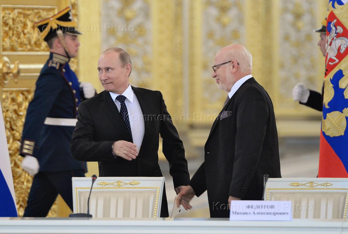 Президент России Владимир Путин (в ценре) и председатель Совета при президенте России по развитию гражданского общества и правам человека Михаил Федотов (справа) на заседании Совета при президенте России по развитию гражданского общества и правам человека. Заседание прошло в Александровском зале Большого Кремлевского дворца.