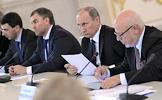 Заседание Совета при президенте России по развитию гражданского общества и правам человека. Слева направо: помощник президента России Игорь Щеголев, первый заместитель руководителя администрации президента России Вячеслав Володин, президент России Владимир Путин, председатель Совета при президенте России по развитию гражданского общества и правам человека Михаил Федотов на заседании в Кремле.