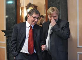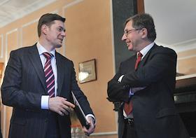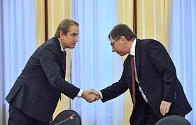 Владелец и генеральный директор ОАО "Северсталь" Алексей Мордашов (слева) и президент "Альфа-банка"Петр Авен (справа) перед началом заседания Совета по инвестициям при председателе Государственной думы (ГД) России. Заседание прошло в Доме приемов ГД России.