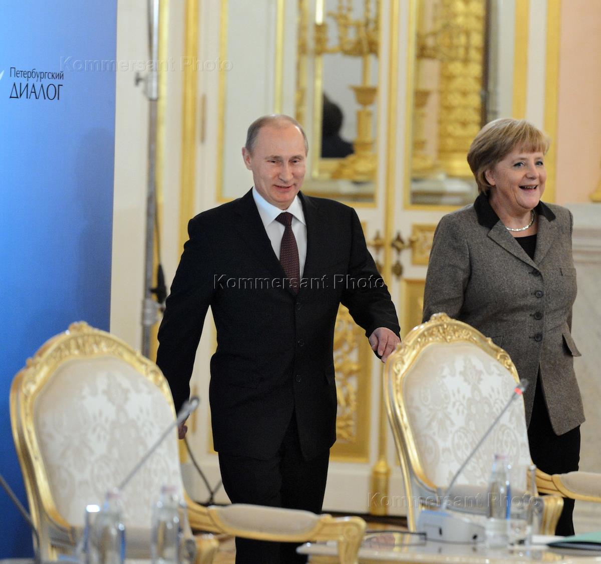 Президент России Владимир Путин (слева) и канцлер Германии Ангела Меркель (справа) на пленарном заседании в рамках XII российско-германского форума гражданских обществ "Петербургский диалог". Заседание прошло в Большом Кремлевском дворце.
