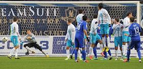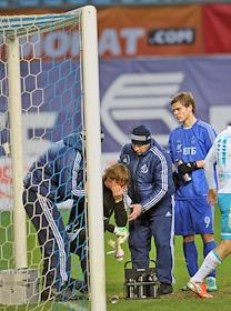 СОГАЗ Чемпионат России - 2012/2013. Матч между командами "Динамо" (Москва) и "Зенит" (Санкт-Петербург) прошел на стадионе "Арена Химки". Вратарь ФК "Динамо" Антон Шунин после взорвавшейся у его ног петарды.