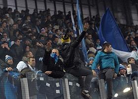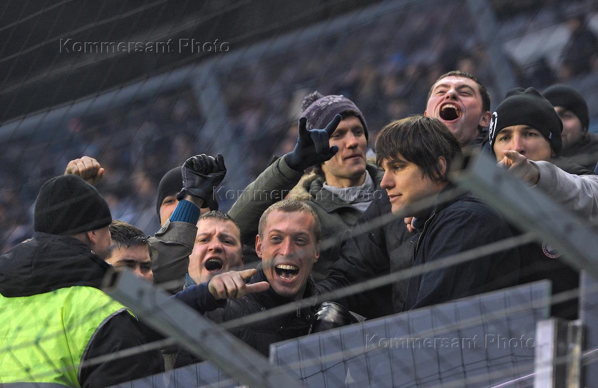 СОГАЗ Чемпионат России - 2012/2013. Матч между командами "Динамо" (Москва) и "Зенит" (Санкт-Петербург) прошел на стадионе "Арена Химки". Болельщики на трибуне во время матча.