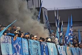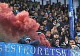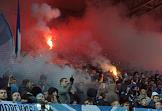 СОГАЗ Чемпионат России - 2012/2013. Матч между командами "Динамо" (Москва) и "Зенит" (Санкт-Петербург) прошел на стадионе "Арена Химки". Болельщики на трибуне с горящими файерами во время матча.