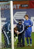 СОГАЗ Чемпионат России - 2012/2013. Матч между командами "Динамо" (Москва) и "Зенит" (Санкт-Петербург) прошел на стадионе "Арена Химки". Вратарь ФК "Динамо" Антон Шунин (слева), нападающий Александр Кокорин (в центре) и полузащитник Иван Соловьев (справа) после взорвавшейся у ног вратаря петарды.