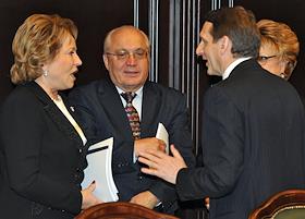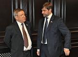 Председатель Московской городской думы Владимир Платонов (слева) и представитель в Совете Федерации России от законодательного (представительного) органа государственной власти Владимирской области Александр Савенков (справа) на семинаре руководителей законодательных органов государственной власти субъектов России – членов Совета законодателей. Семинар прошел в здании Фундаментальной библиотеки МГУ им.М.В.Ломоносова.