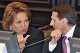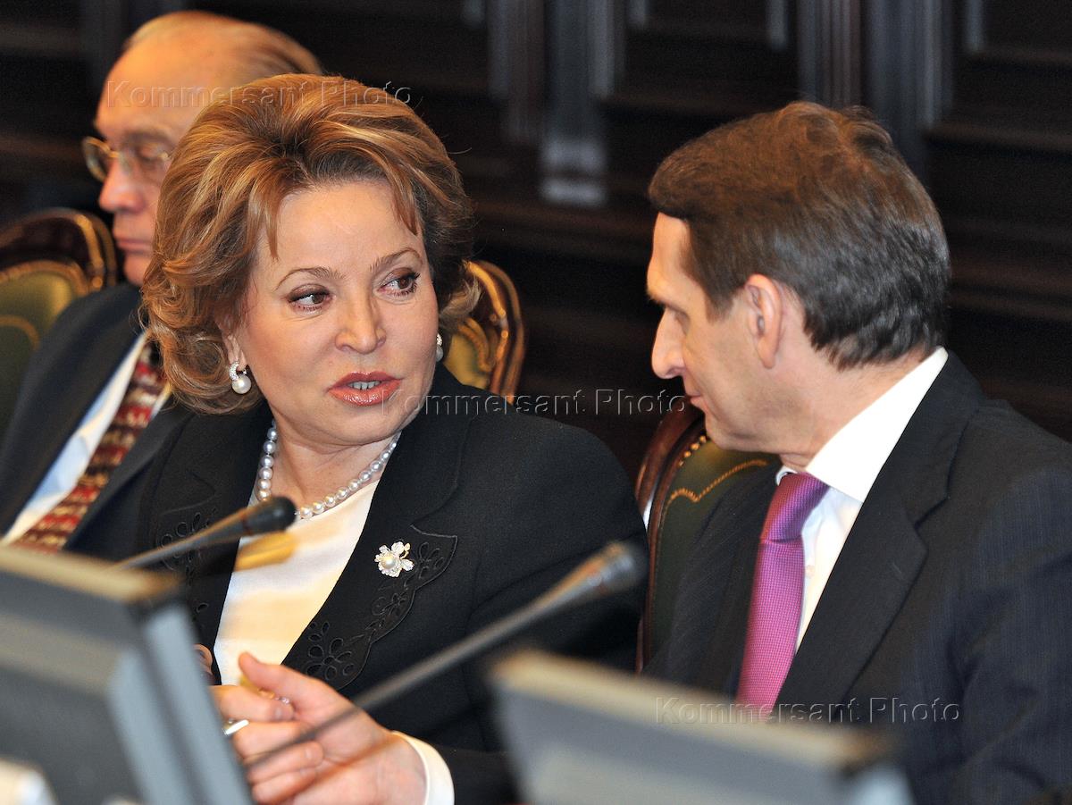 Сопредседатели Совета законодателей России при Федеральном Собрании России, председатель Совета Федерации Валентина Матвиенко (в центре) и председатель Государственной думы Сергей Нарышкин (справа) на открытии семинара руководителей законодательных органов государственной власти субъектов России – членов Совета законодателей. Заседание прошло в здании Фундаментальной библиотеки МГУ имени М.В.Ломоносова.