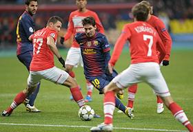 Лига чемпионов УЕФА 2012/13. Защитник ФК "Спартак" Марек Сухи (второй слева), нападающий ФК "Барселона" Лионель Месси (в центре) и полузащатник ФК "Спартак" Кирилл Комбаров (второй справа) во время матча между командами "Спартак" (Москва) и "Барселона" (Испания). Матч прошел на Большой спортивной арене (БСА) спорткомплекса "Лужники".