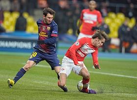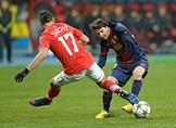 Лига чемпионов УЕФА 2012/13. Футболист ФК "Барселона" Лионель Месси (слева) и полузащитник ФК "Спартак" Дмитрий Комбаров (справа) во время матча между командами "Спартак" (Москва) и "Барселона" (Испания). Матч прошел на Большой спортивной арене (БСА) спорткомплекса "Лужники".
