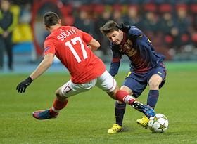 Лига чемпионов УЕФА 2012/13. Защитник ФК "Спартак" Марек Сухи (слева) и нападающий ФК "Барселона" Лионель Месси (справа) во время матча между командами "Спартак" (Москва) и "Барселона" (Испания). Матч прошел на Большой спортивной арене (БСА) спорткомплекса "Лужники".