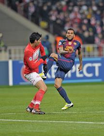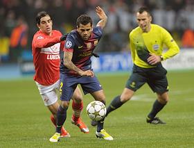 Лига чемпионов УЕФА 2012/13. Матч между командами "Спартак" (Москва) и "Барселона" (Испания) прошел на стадионе "Лужники". Футболист команды "Спартак" Хуан Инсауральде (cлева) и игрок команды "Барселона" Дани Алвеш (справа) во время матча.