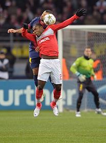 Лига чемпионов УЕФА 2012/13. Полузащитник ФК "Спартак" Дмитрий Комбаров (слева) и нападающий ФК "Барселона" Педро Родригес (справа) во время матча между командами "Спартак" (Москва) и "Барселона" (Испания). Матч прошел на Большой спортивной арене (БСА) спорткомплекса "Лужники".