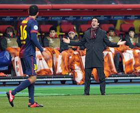 Лига чемпионов УЕФА 2012/13. Матч между командами "Спартак" (Москва) и "Барселона" (Испания). Главный тренер "Спартака" Унаи Эмери (слева) и тренер команды "Барселона" Тито Виланова (слева) на стадионе "Лужники".
