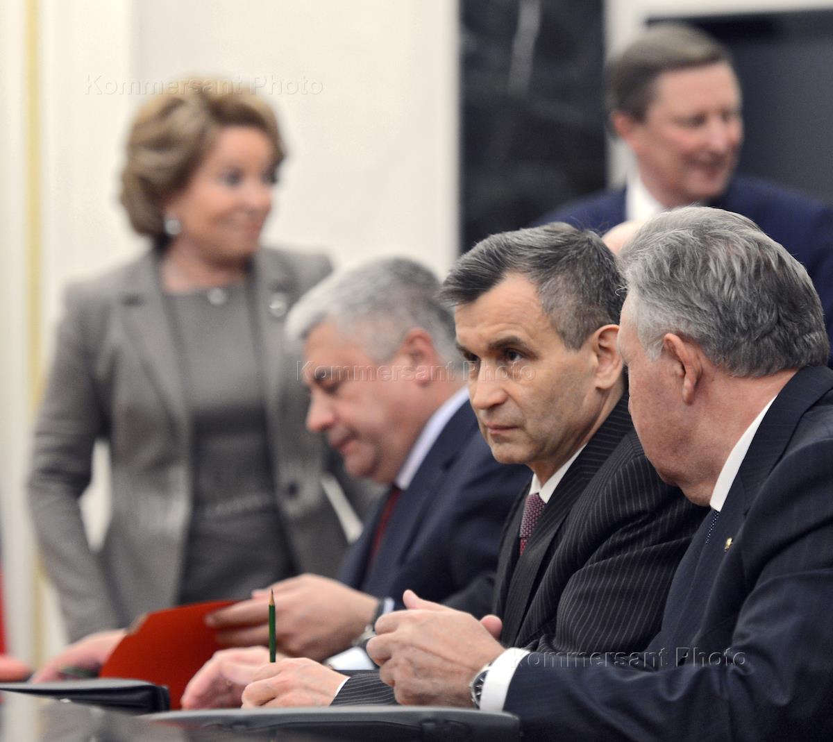 Заседание Совета безопасности, посвященное вступлению России в ВТО. Cлева направо: председатель Совета Федерации России Валентина Матвиенко, руководитель администрации президента России Сергей Иванов, министр внутренних дел России Владимир Колокольцев, директор Службы внешней разведки России Михаил Фрадков, заместитель Секретаря Совета Безопасности России Рашид Нургалиев, министр России по развитию Дальнего Востока, полномочный представитель президента России в Дальневосточном федеральном округе Виктор Ишаев во время заседания в Кремле.