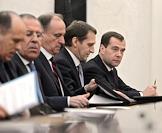 Заседание Совета безопасности, посвященное вступлению России в ВТО. Cлева направо: генеральный прокурор России Юрий Чайка, директор Федеральной службы безопасности (ФСБ) Александр Бортников, министр иностранных дел России Сергей Лавров, председатель правительства России Дмитрий Медведев во время заседания в Кремле.