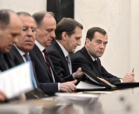 Заседание Совета безопасности, посвященное вступлению России в ВТО. Cлева направо: директор Федеральной службы безопасности (ФСБ) Александр Бортников, министр иностранных дел России Сергей Лавров, секретарь Совета безопасности России Николай Патрушев, председатель Государственной думы России Сергей Нарышкин, председатель правительства России Дмитрий Медведев во время заседания в Кремле.