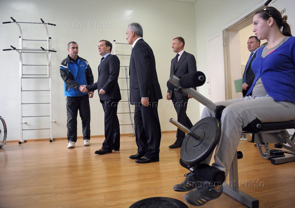 Председатель правительства России Дмитрий Медведев (слева) и министр труда и социальной защиты России Максим Топилин (справа) во время совещания по вопросам трудоустройства инвалидов. Совещание прошло в Московском государственном гуманитарно-экономическмом институте с инклюзивным образованием.