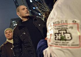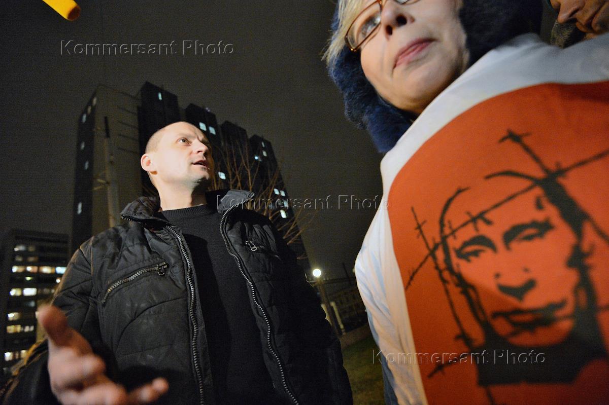 Лидер движения "Левый фронт" Сергей Удальцов (слева) во время акции "Оккупай СК" в формате пикета. Акция прошла у здания Следственного комитета России.