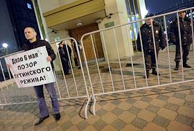 Лидер движения "Левый фронт" Сергей Удальцов (слева) во время акции "Оккупай СК" в формате пикета. Акция прошла у здания Следственного комитета России.
