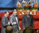 Председатель Правительства России Михаил Касьянов (в центре), министр сельского хозяйства России Алексей Гордеев (слева) и вице-мэр Москвы Валерий Шанцев (справа) на церемонии открытия российской агропромышленной выставки "Золотая осень 2002" во Всероссийском выставочном центре (ВВЦ). Выставка проводится в рамках Агропромышленной недели, приуроченной к Дню работника сельского хозяйства и перерабатывающей промышленности.