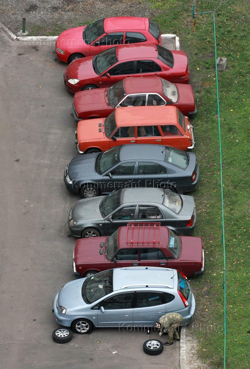 Жанровая фотография. Сезон замены летней резины на зимнюю. Водитель на стоянке меняет колеса автомобиля.