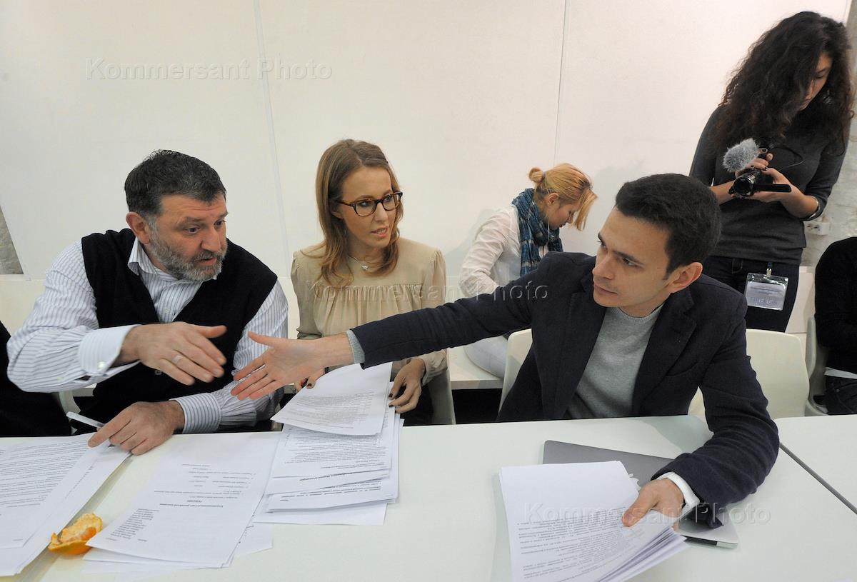 Второе заседание Координационного совета оппозиции. Cлева направо: журналист Сергей Пархоменко, телеведущая, главный редактор журнала SNC Ксения Собчак, член бюро движения "Солидарность" Илья Яшин на заседании в помещении Фотогалереи имени Братьев Люмьер на "Красном Октябре".