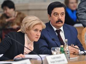 Заместитель председателя правительства России Ольга Голодец (слева) и руководитель аппарата Счетной палаты России Сергей Шахрай (справа) во время заседания "круглого стола" на тему "Уроки истории России ХХ века в мировом контексте".