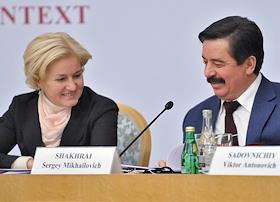 Руководитель аппарата Счетной палаты России Сергей Шахрай (справа) и вице-президент РАН, ректор МГУ имени М.В.Ломоносова Виктор Садовничий (справа) во время заседания "круглого стола" на тему "Уроки истории России ХХ века в мировом контексте".