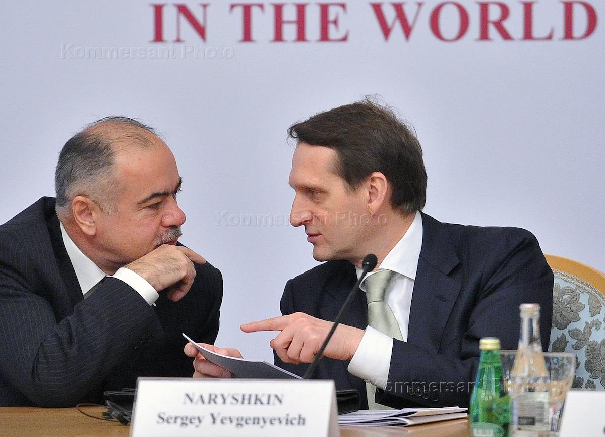 Заместитель председателя Совета Федерации России Ильяс Умаханов (слева) и председатель Государственной думы России Сергей Нарышкин (справа) во время заседания "круглого стола" на тему "Уроки истории России ХХ века в мировом контексте".