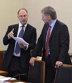 Заместитель руководителя администрации президента России, пресс-секретарь президента Дмитрий Песков (справа) перед началом заседания Организационного комитета по подготовке и обеспечению председательства России в "Группе двадцати в 2013 году.