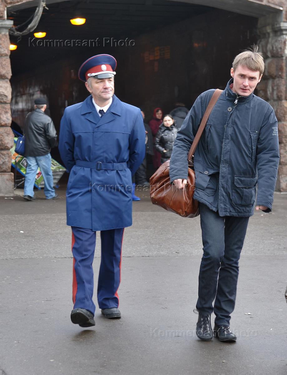 Участник казачьей дружины во время патрулирования на площади у Белорусского вокзала.