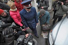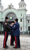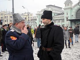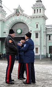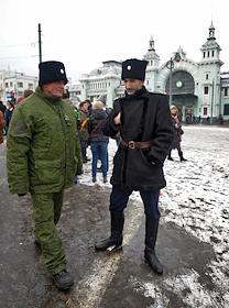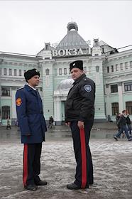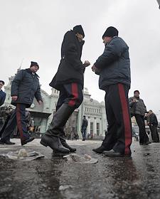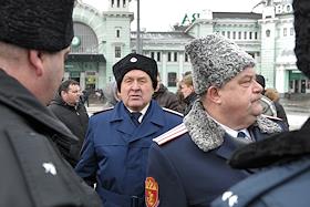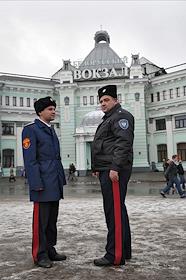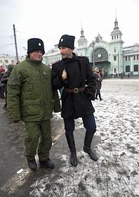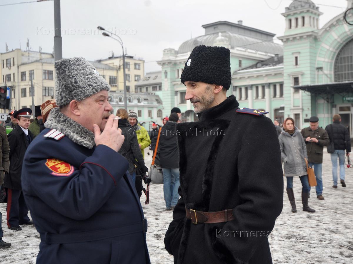 Казачьи дружины во время патрулирования на площади Белорусского вокзала.