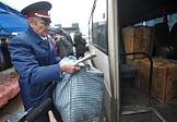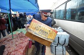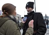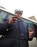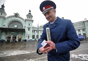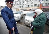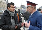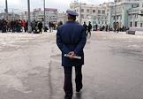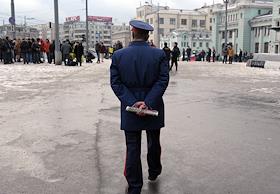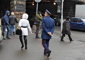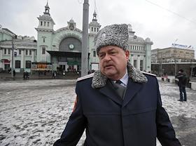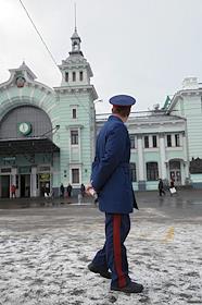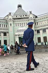 Участник казачьей дружины во время патрулирования на площади у Белорусского вокзала.