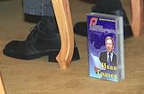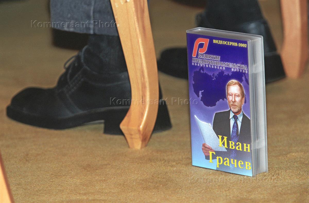 Расширенное заседание политсовета партии "Развитие предпринимательства" на тему: "Партия на парламентских выборах в 2003 году намерена преодолеть пятипроцентный барьер". Заседание проходило в "Президент-отеле". Видеокассета с портретом лидера партии "Развитие предпринимательства" Ивана Грачева стоит на полу.