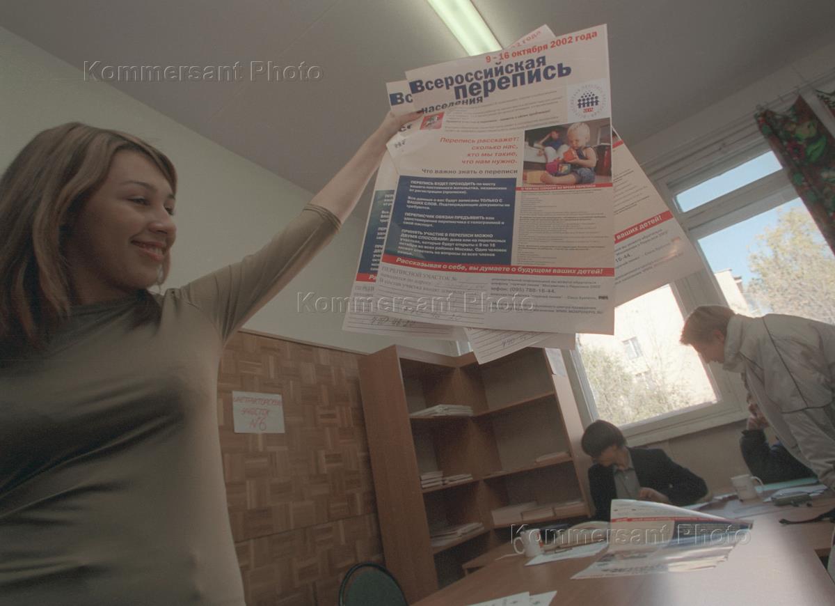 Всероссийская перепись населения (9-16 октября 2002 г.) Переписчик с рекламными листками в стационарном пункте переписи населения.